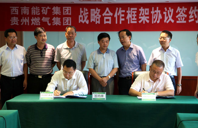 本网讯(文:李克虎 图 :马超)2014年7月23日,西南能矿集团、贵州燃气(集团)战略合作签约仪式在西南能矿集团36楼会议室举行。贵州燃气(集团)董事长洪鸣,总经理吕钢,副总经理、总工程师程跃东和西南能矿集团董事长李在文,总经理赵震海,党委副书记王永茂,副总经理仇雅鸣,总会计师雷治昌及贵州省能源局新能源处处长卓军等领导出席签字仪式。